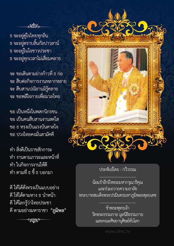 ดี ให้ได้ตามทาง ธ นำหน้า ดี ให้โลกรู้ว่าไทยประชา ดี ตามอย่างมหาราชา "ภูมิพล"